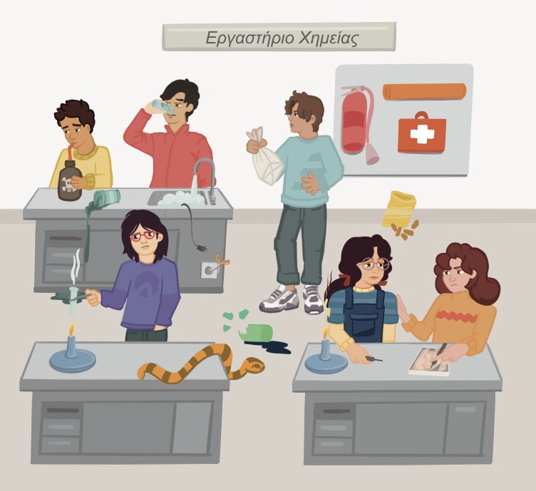 Επιλέξτε στην αρχική οθόνη ποια δραστηριότητα επιθυμείτε να πραγματοποιήσετε. Στην πρώτη δραστηριότητα απαντήστε στις ερωτήσεις σωστού-λάθους και στη δεύτερη δραστηριότητα εντοπίστε τα σφάλματα συμπεριφοράς που μπορούν να πραγματοποιηθούν σ' ένα Εργαστήριο Χημείας κάνοντας κλικ πάνω στην εικόνα στα σημεία που πιστεύετε ότι βρίσκονται.